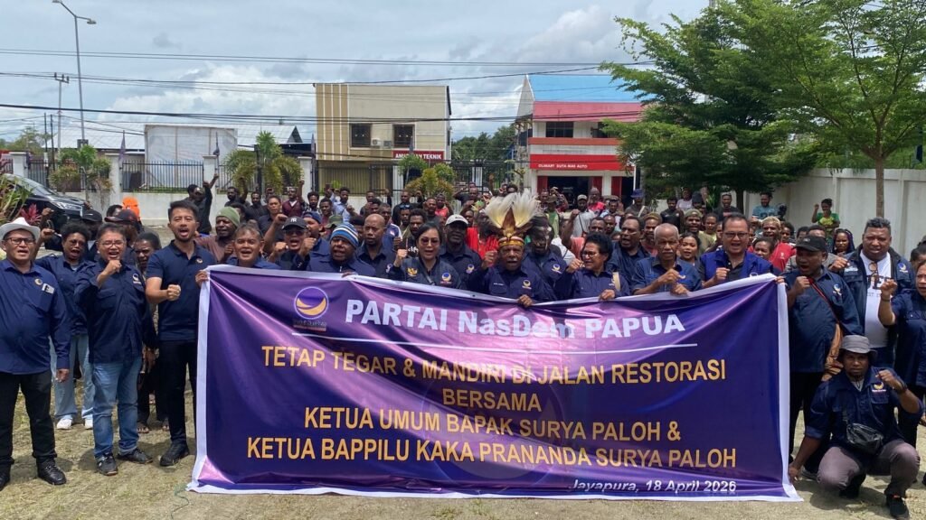 Pernyataan tersebut disampaikan langsung oleh Ketua DPW NasDem Papua, Mathius Awoitauw, bersama seluruh kader partai di halaman Kantor DPW NasDem Papua, Sabtu (18/4/2026) siang. Aksi ini turut disaksikan oleh masyarakat Papua yang hadir memberikan dukungan.